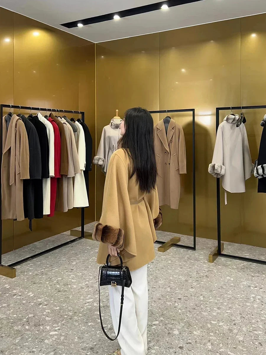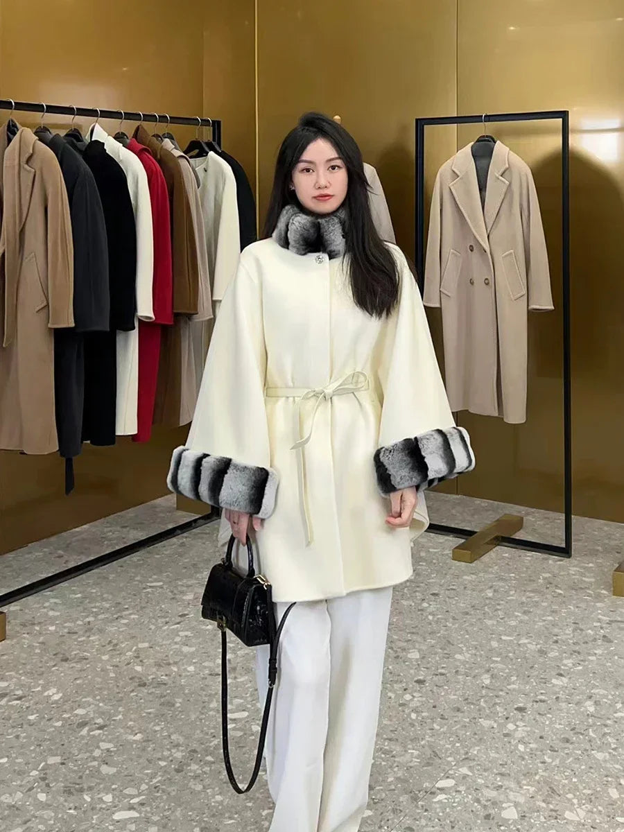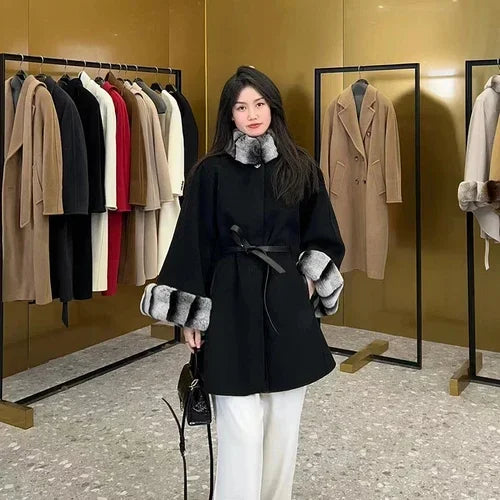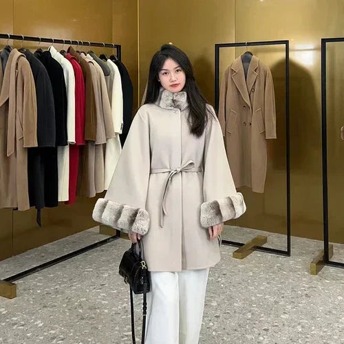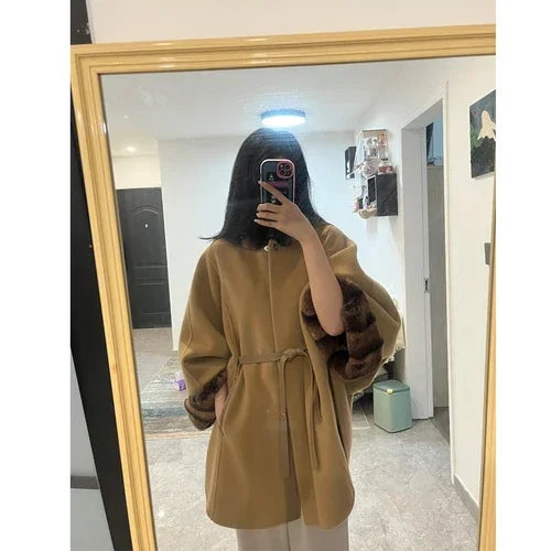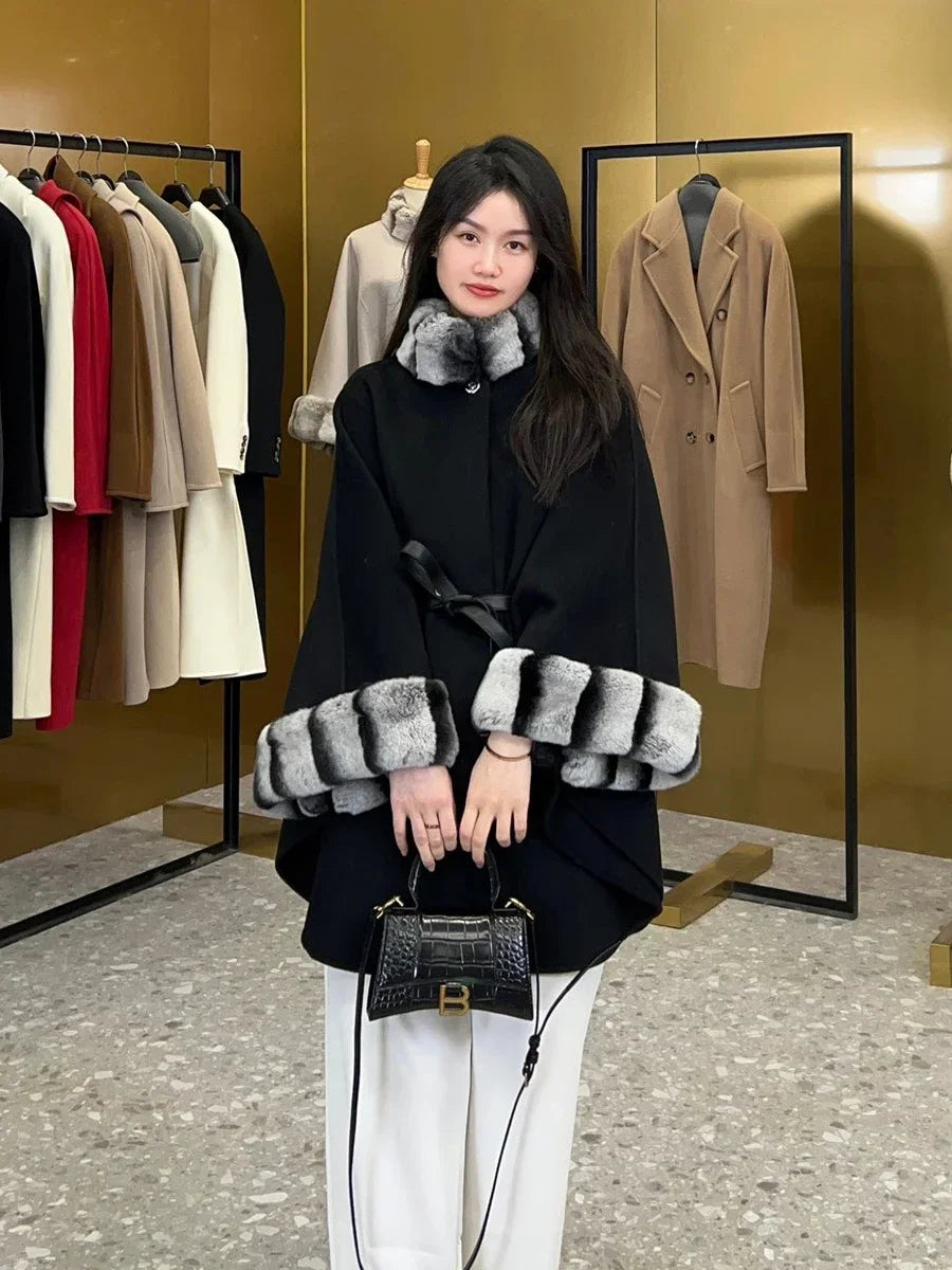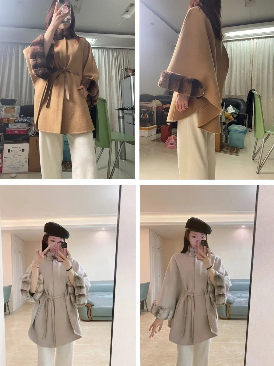 LPSalzburg cape cashmere coat for women, 100% cashmere double-sided woolen fabric paired with otter rabbit fur coat for women