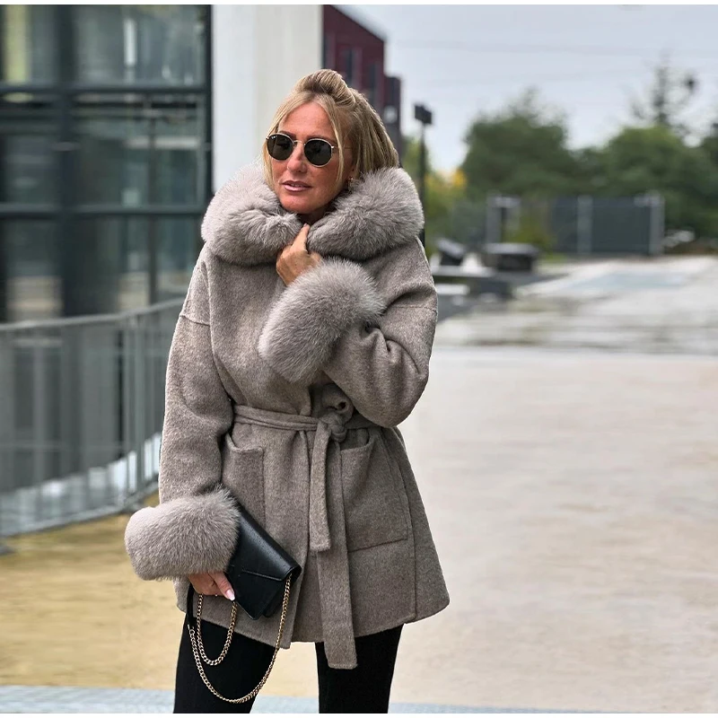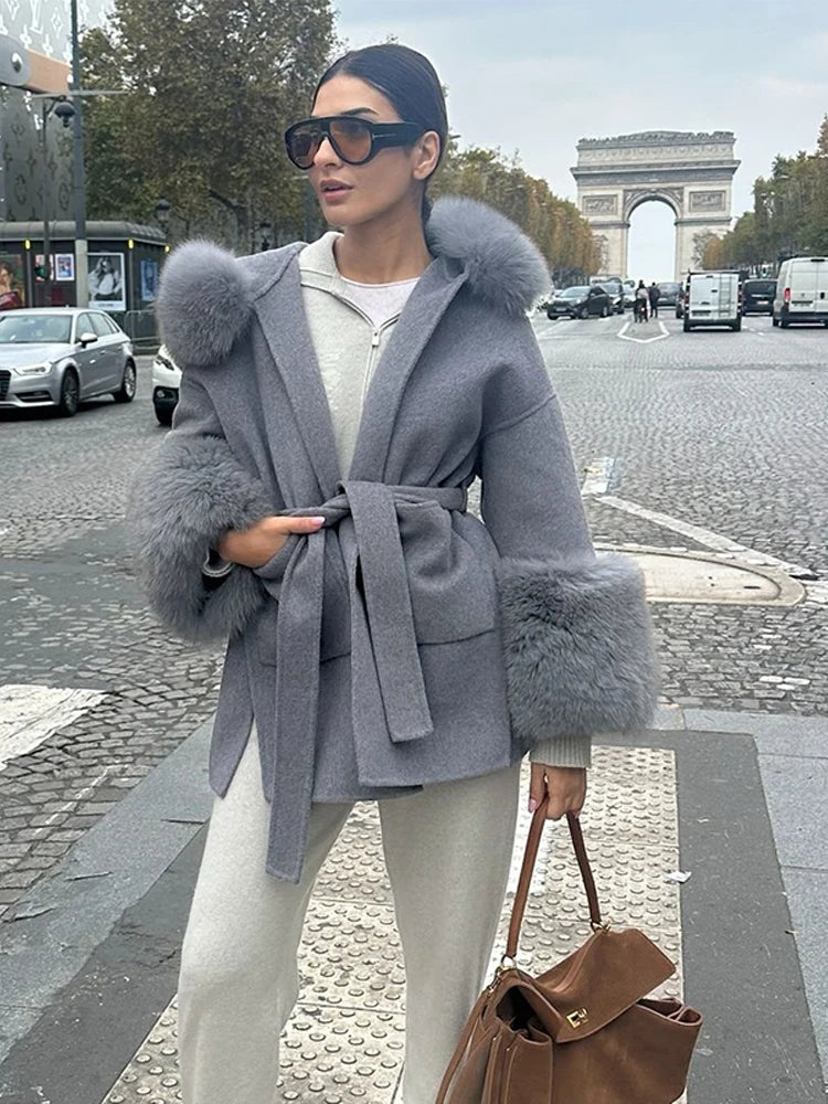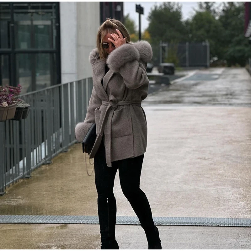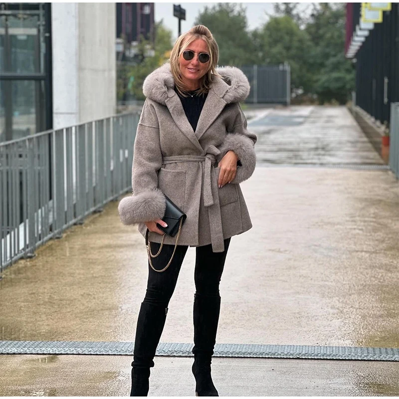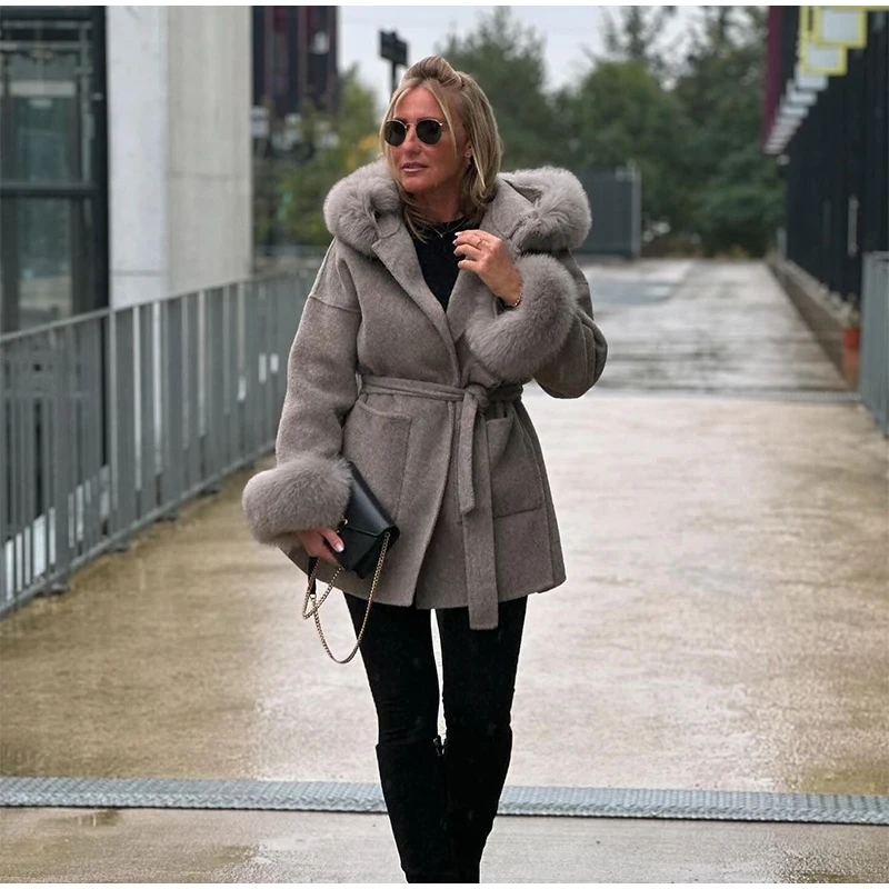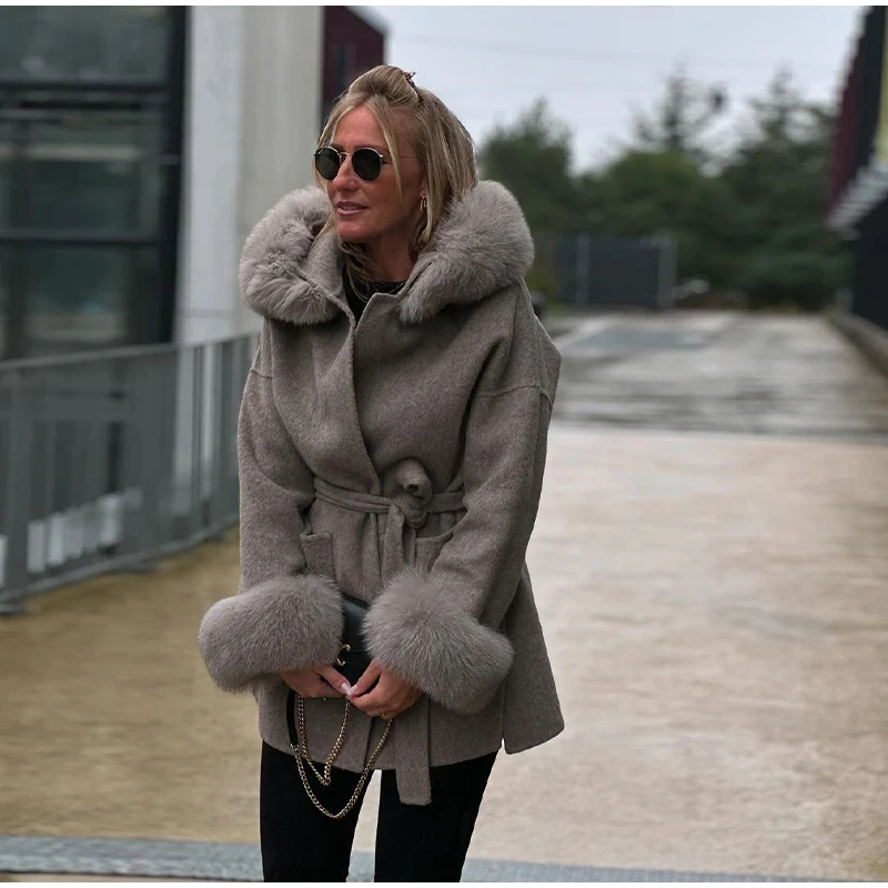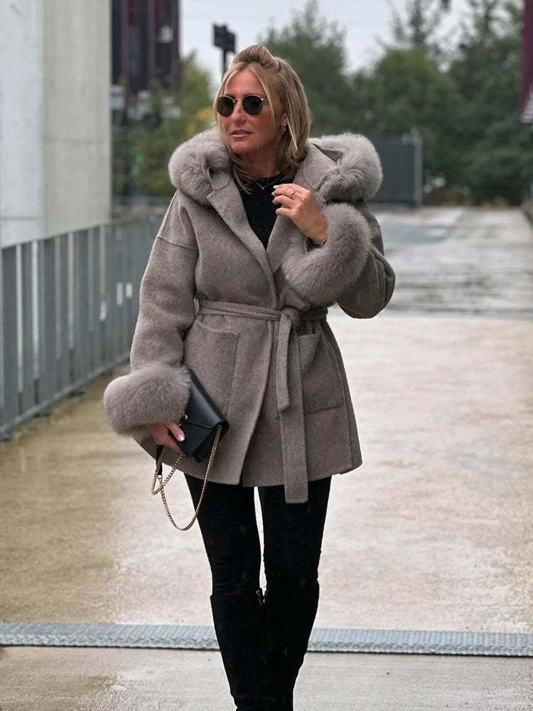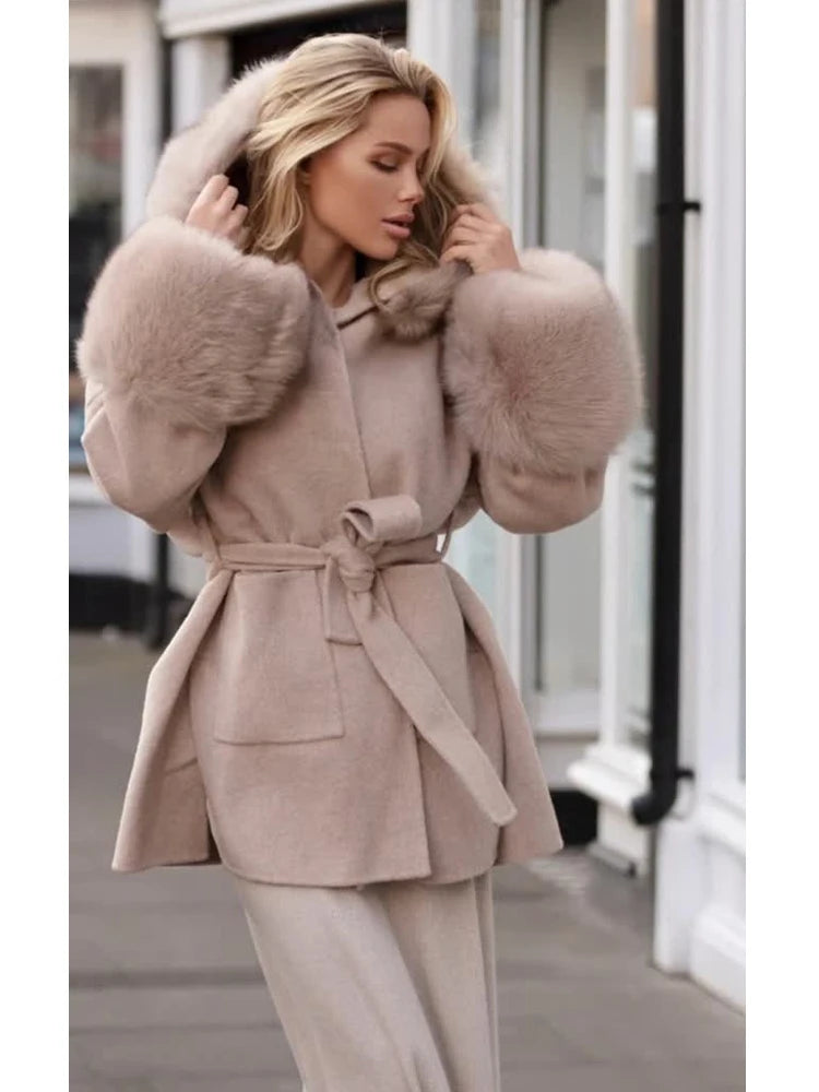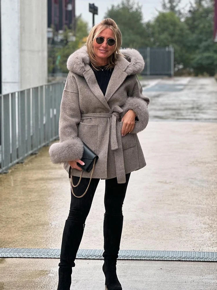 Women Solid Fur Collar Hooded Woolen Overcoat Casual Plush Cuff Lace Up Pockets Mid-length Coat 2025 Lady Daily Commute Wear New
