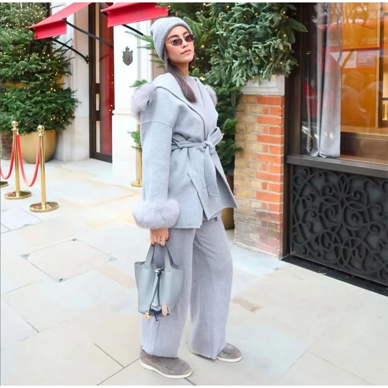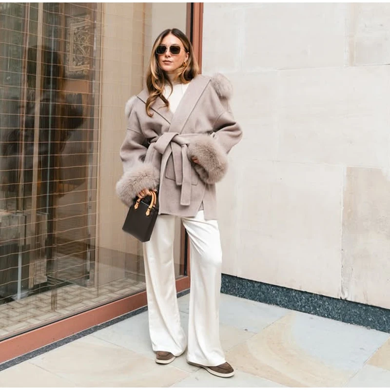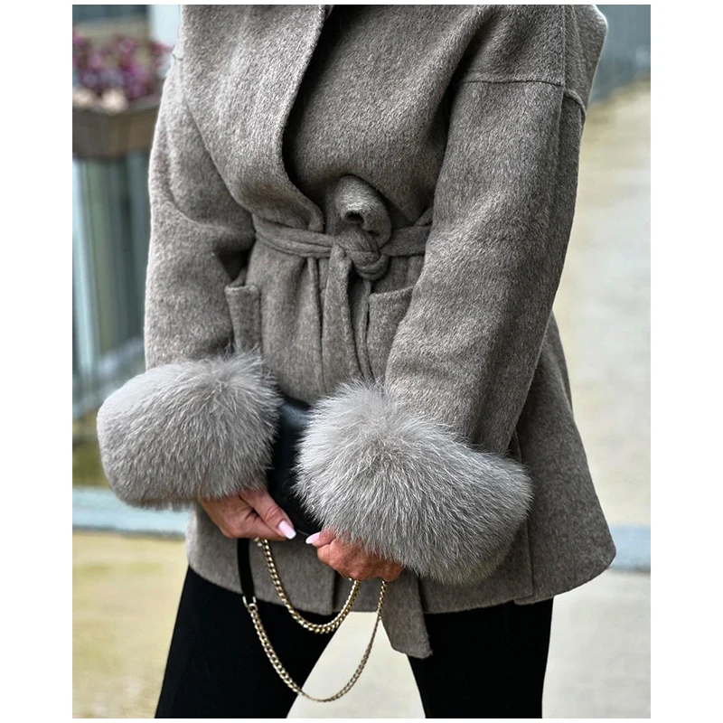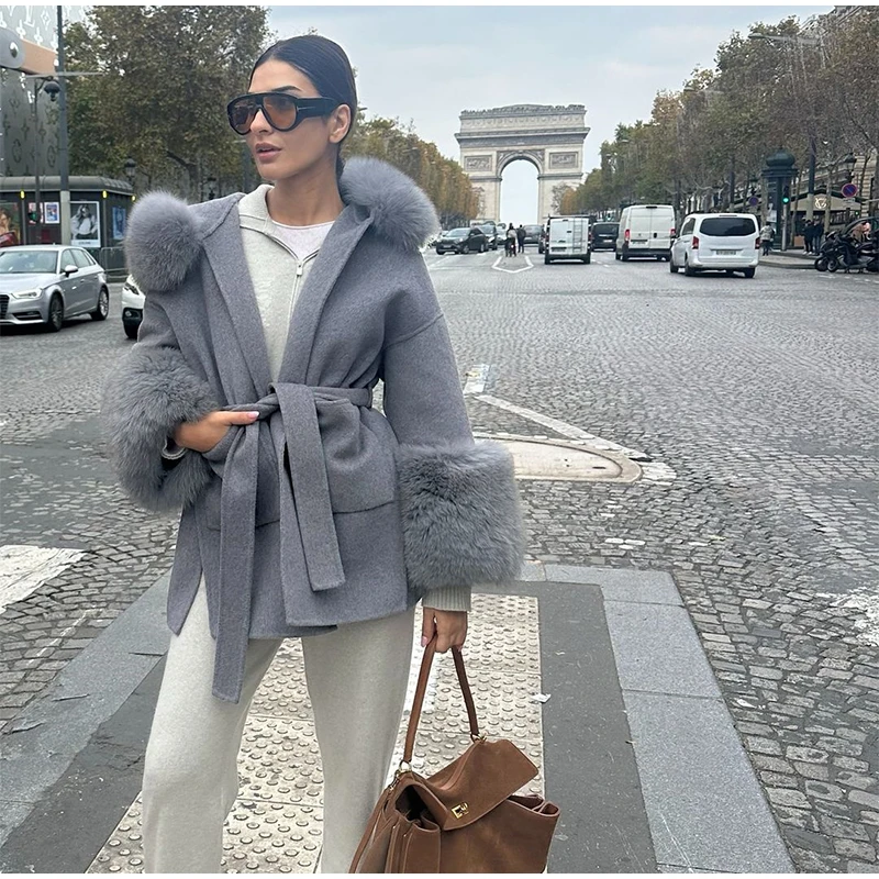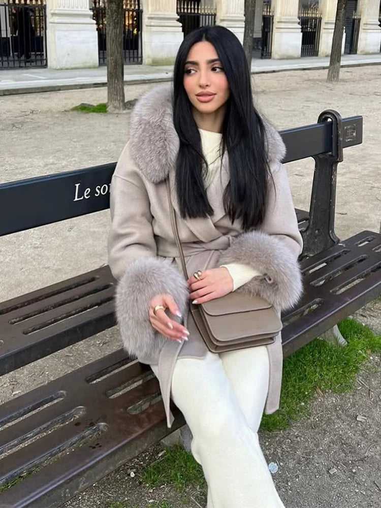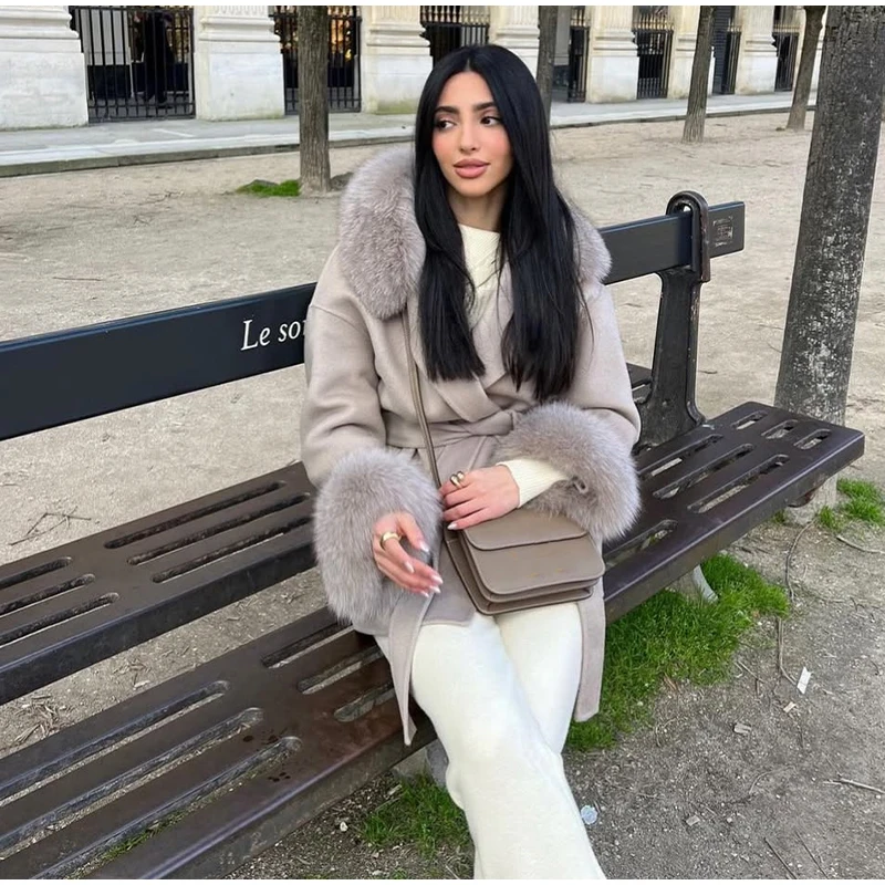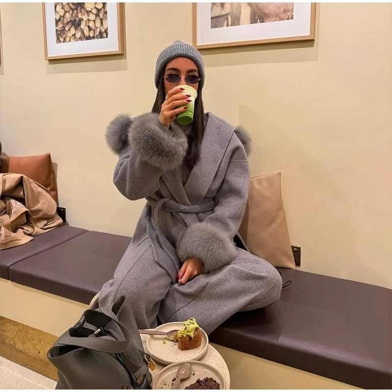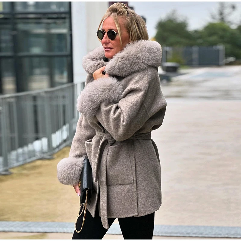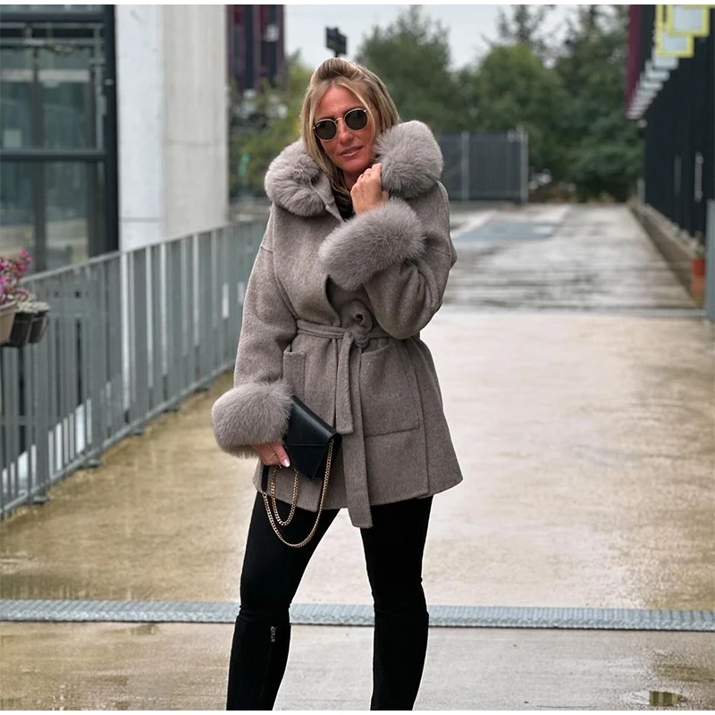 Women Solid Fur Collar Hooded Woolen Overcoat Casual Plush Cuff Lace Up Pockets Mid-length Coat 2025 Lady Daily Commute Wear New